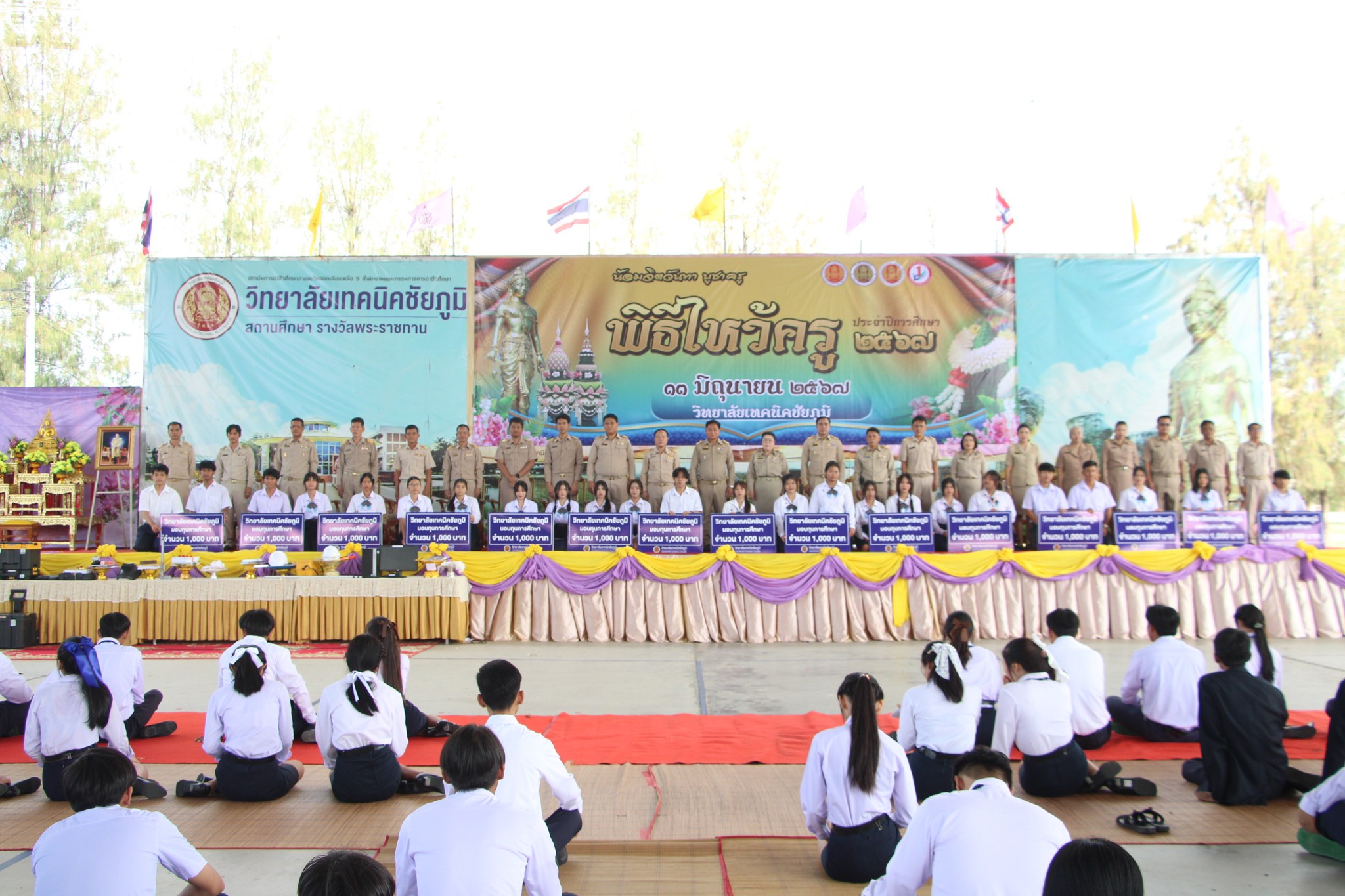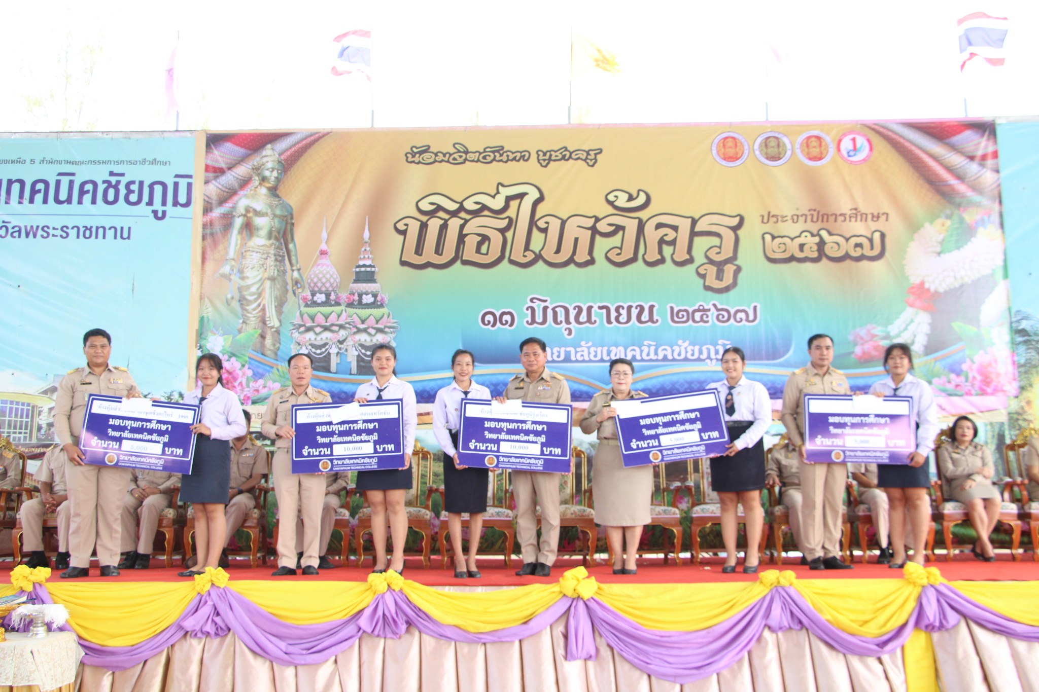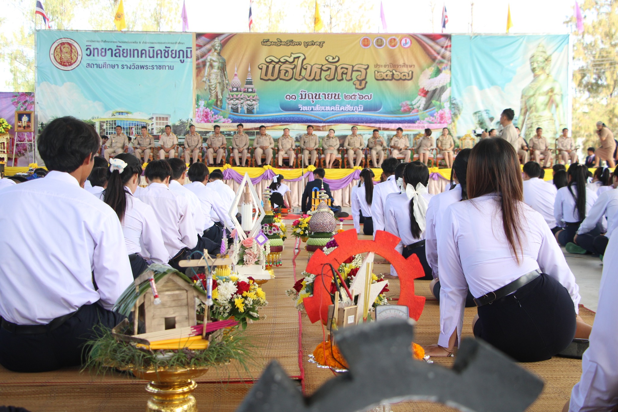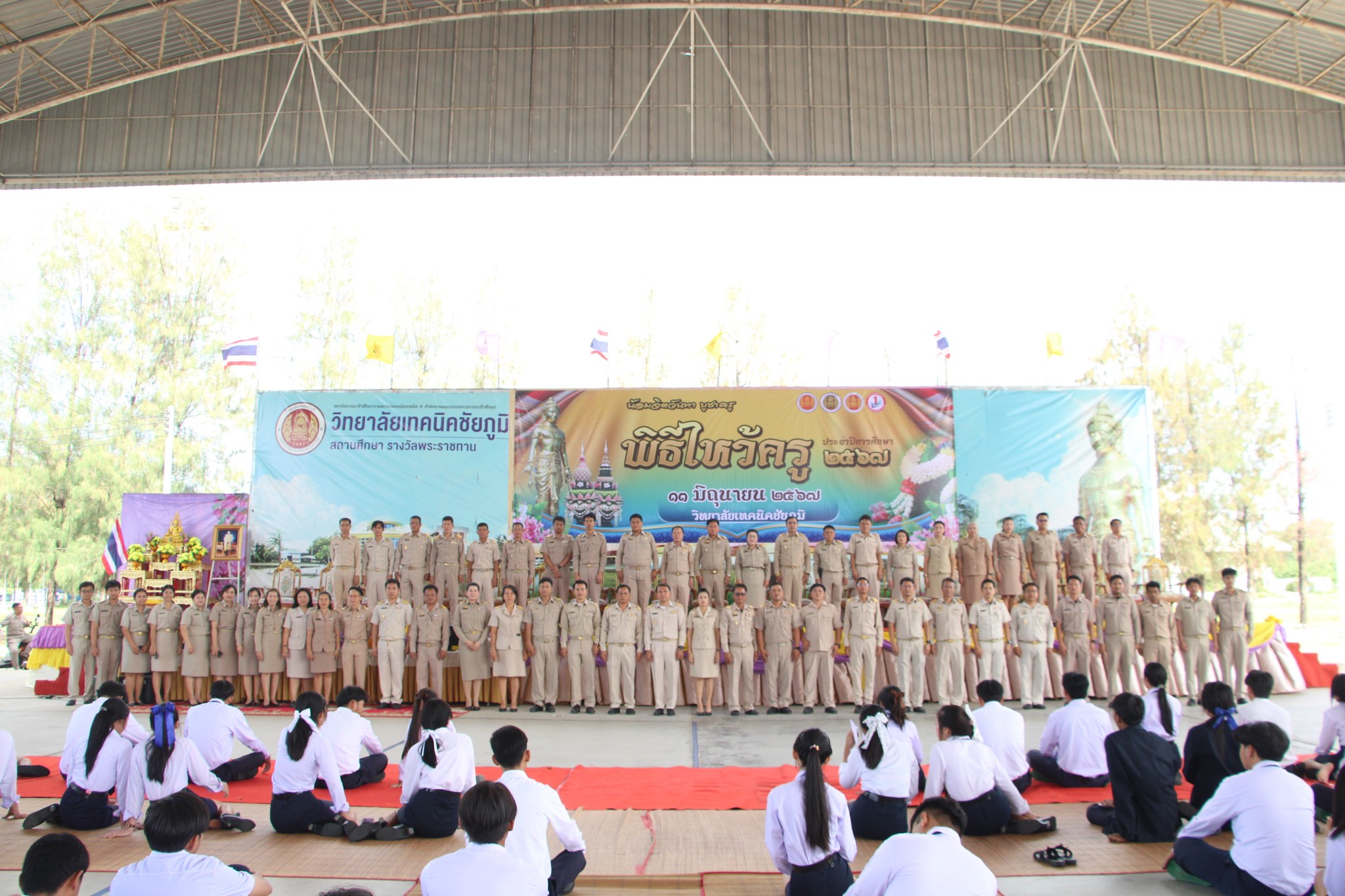 วันพฤหัสที่ 13 มิถุนายน พ.ศ.2567 ดร.ประสิทธิ์ ทองรัศมี ผู้อำนวยการวิทยาลัยเทคนิคชัยภูมิ ได้เป็นประธานในพิธีไหว้ครู ประจำปีการศึกษา 2567 พร้อมด้วยรองผุ้อำนวยการทั้ง 4 ฝ่าย ครู บุคลากรทางการศึกษาและนักเรียนนักศึกษา ณ โดมหน้าเสาธง วิทยาลัยเทคนิคชัยภูมิ