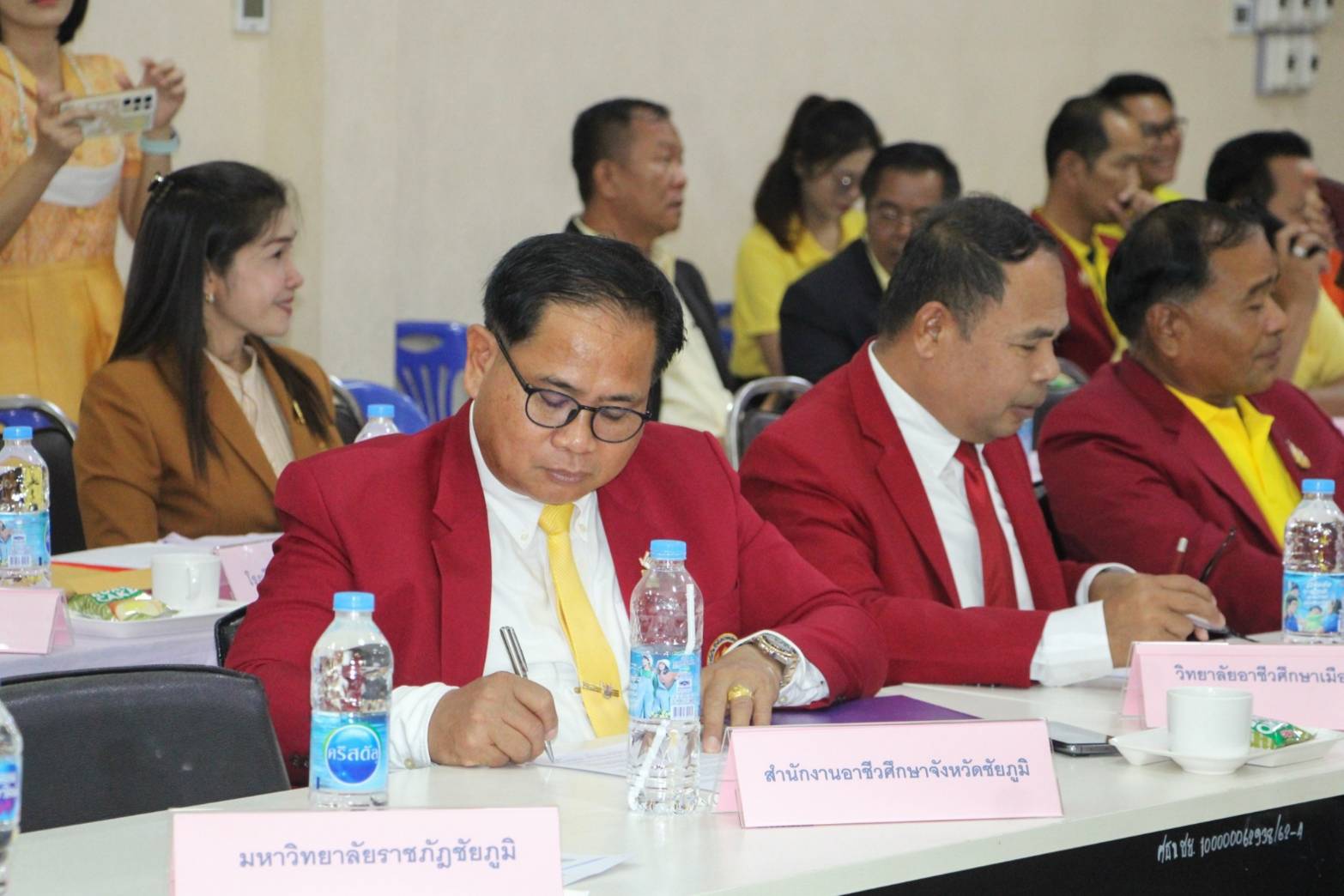 วันพุธที่ 10 กรกฏาคม 2567 ดร.ประสิทธิ์ ทองรัศมี ผู้อำนวยการวิทยาลัยเทคนิคชัยภูมิ ปฎิบัติหน้าที่ ผู้อำนวยการสำนักงานอาชีวศึกษาจังหวัดชัยภูมิ พร้อมด้วยผู้บริหารสถานศึกษาอาชีวศึกษาภาครัฐ สังกัดสำนักงานอาชีวศึกษาจังหวัดชัยภูมิ เข้าร่วมบันทึกข้อตกลงความร่วมมือ (MOU) ตามโครงการส่งเสริมเวทีและประชาคมเพื่อจัดทำรูปแบบและการพัฒนาหลักสูตรต่อเนื่องเชื่อมโยงการศึกษาขั้นพื้นฐานกับอาชีวศึกษาและอุดมศึกษาจังหวัดชัยภูมิ โดยมี นายไพศาล ที่รัก ศึกษาธิการจังหวัดชัยภูมิ เป็นประธานการบันทึกข้อตกลงความร่วมมือ (MOU) ณ หอประชุมศึกษาธิการจังหวัดชัยภูมิ