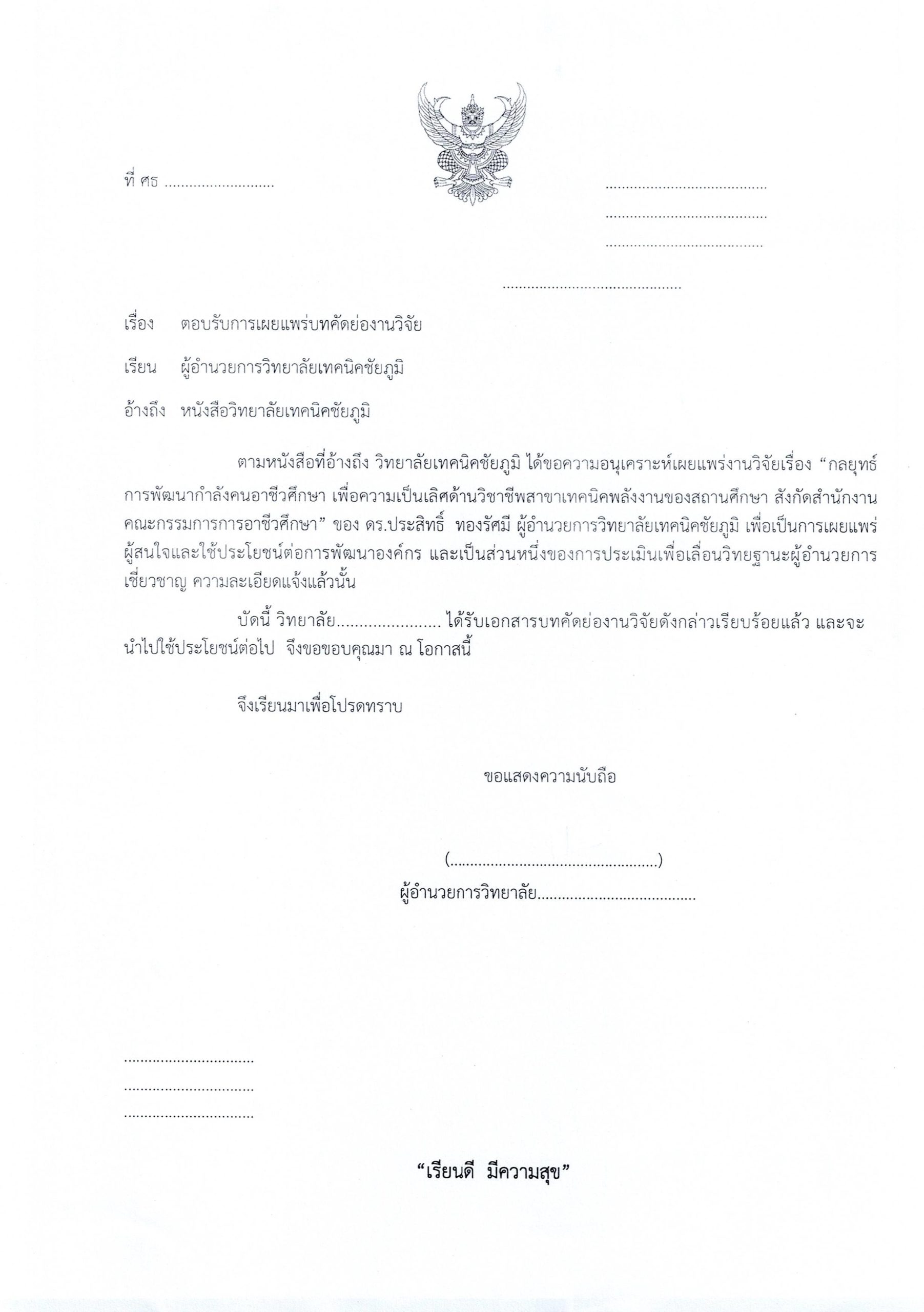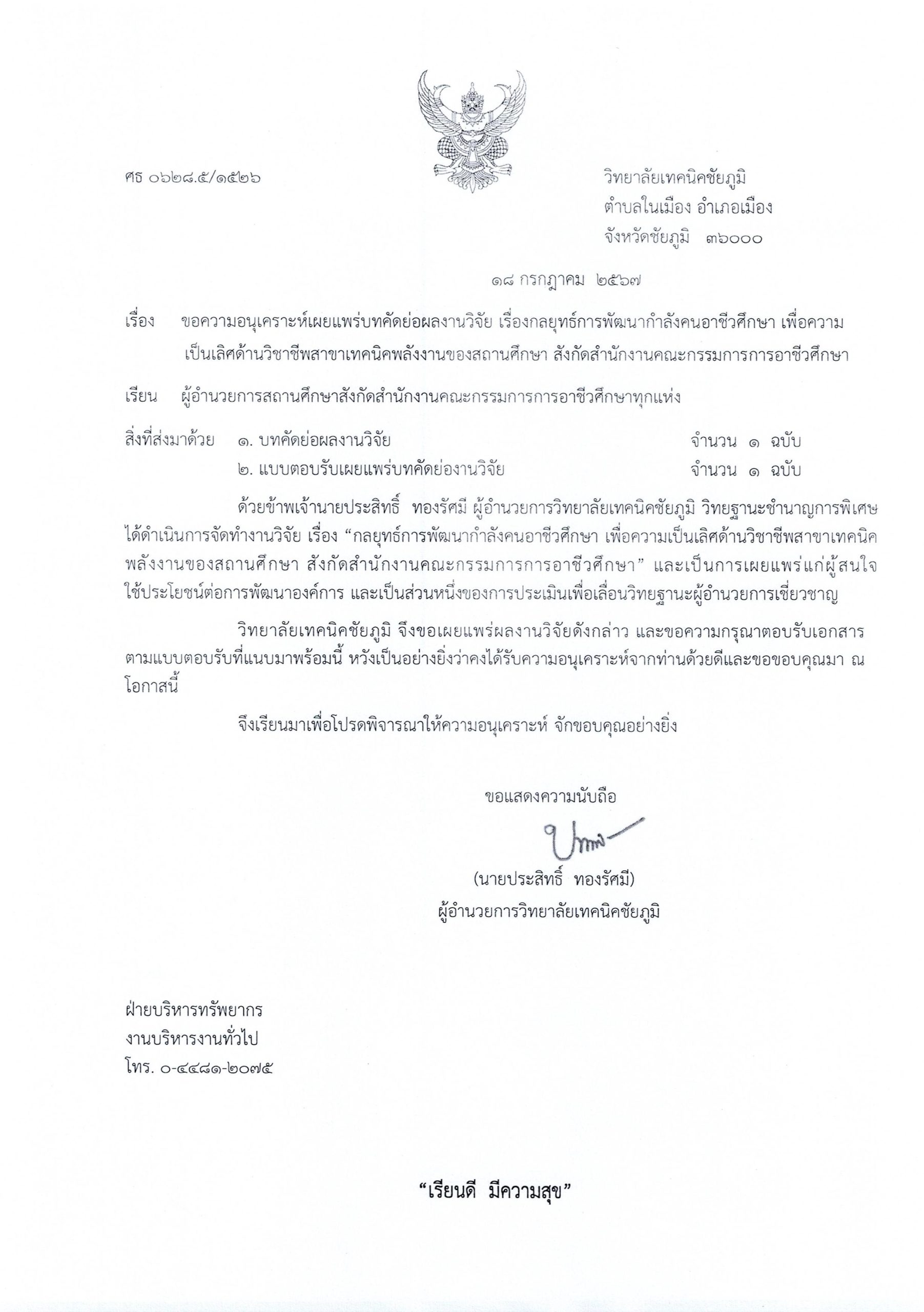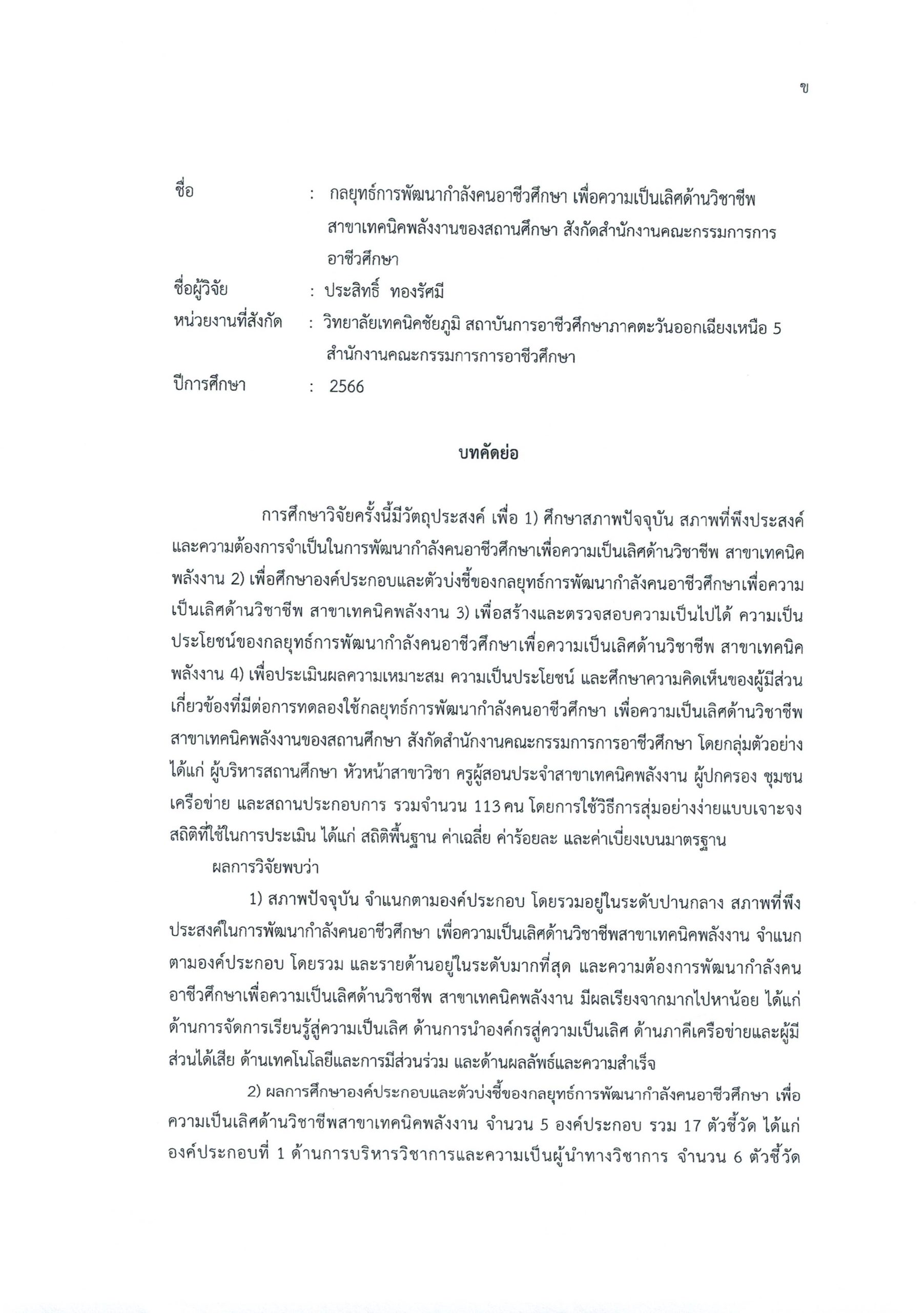 เผยแพร่ผลงานวิชาการ ขออนุเคราะห์เผยแพร่บทคัดย่อผลงานวิจัย เรื่องกลยุทธ์การพัฒนากำลังคนอาชีวศึกษา เพื่อความเป็นเลิสด้านวิชาชีพ ฯ 18 กรกฎาคม 2024 root