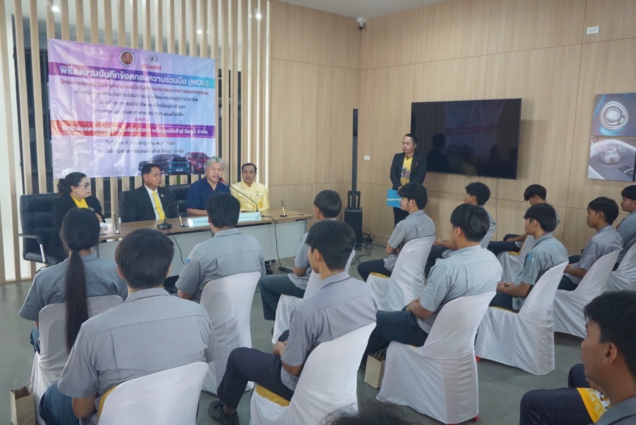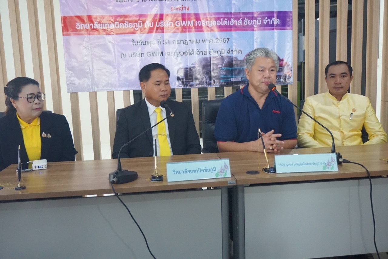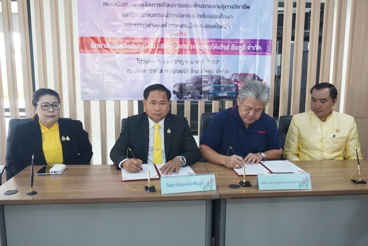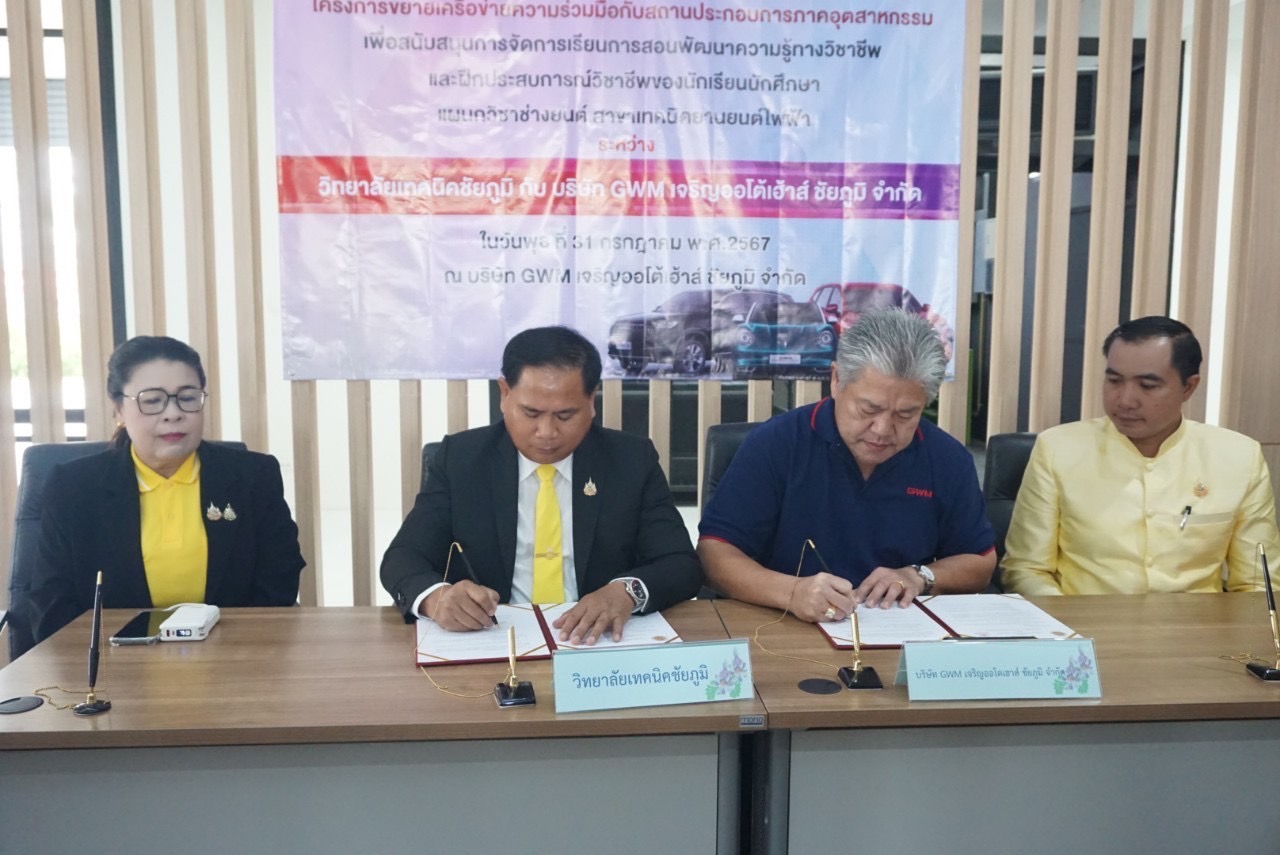 เช้านี้ 31 กรกฎาคม 2567 เวลา 09.00 น. นำโดย ดร.ประสิทธิ์ ทองรัศมี ผู้อำนวยการวิทยาลัยเทคนิคชัยภูมิ พร้อมด้วยนางอังคณา เบ็ญจศิล รองผู้อำนวยการฝ่ายแผนงานและความร่วมมือ นายปรีชา อารีวงษ์ รองผู้อำนวยการฝ่ายวิชาการ และคณะครู นักศึกษา แผนกวิชาช่างยนต์ สาขางานเทคนิคยานยนต์ไฟฟ้า ร่วมทำพิธีลงนามบันทึกข้อตกลงความร่วมมือ (MOU) โครงการขยายความร่วมมือกับสถานประกอบการภาคอุตสาหกรรม ด้านเทคโนโลยียานยนต์ไฟฟ้า (electric vehicle : EV) ณ บริษัท GWM เจริญออโตเฮาส์ ชัยภูมิ จำกัด โดยมีท่านนายบรรยงค์ เกียรติก้องชูชัย กรรมการผู้จัดการ บริษัท GWM เจริญออโตเฮาส์ ชัยภูมิ จำกัด ให้เกียรติเป็นผู้ลงนามในนามบริษัทดังกล่าว