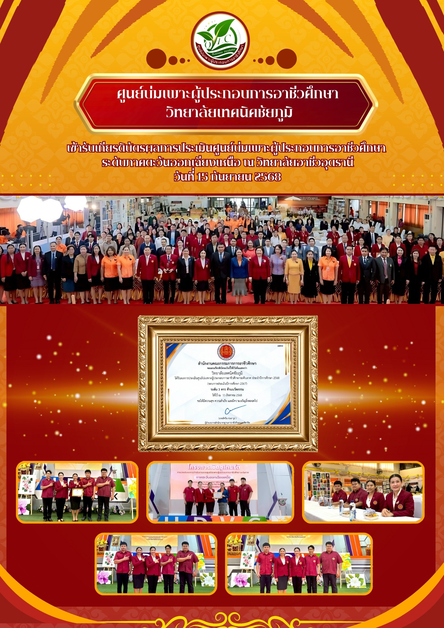 ศูนย์บ่มเพาะผู้ประกอบการอาชีวศึกษา วิทยาลัยเทคนิคชัยภูมิ เข้าร่วมรับเกียติบัตรโครงการ “เชิดชูเกียรติการประเมินผลการดำเนินงานของศูนย์บ่มเพาะผู้ประกอบการอาชีวศึกษา ระดับภาค ภาคตะวันออกเฉียงเหนือ” ประจำปีงบประมาณ 2568 (รอบการประเมินปีการศึกษา 2567)