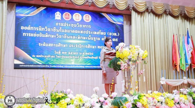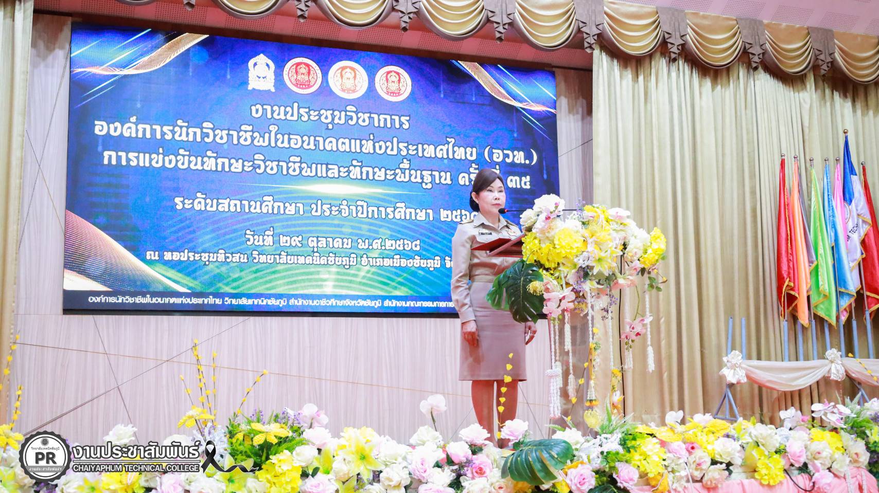 ดร.กรรณิกา ยอดสง่า ผู้อำนวยการวิทยาลัยเทคนิคชัยภูมิ เป็นประธานเปิดงานการประชุมวิชาการองค์การนักวิชาชีพแห่งประเทศไทย (อวท.) การแข่งขันทักษะวิชาชีพและทักษะพื้นฐาน ครั้งที่ 35 ระดับสถานศึกษาประจำปีการศึกษา 2568