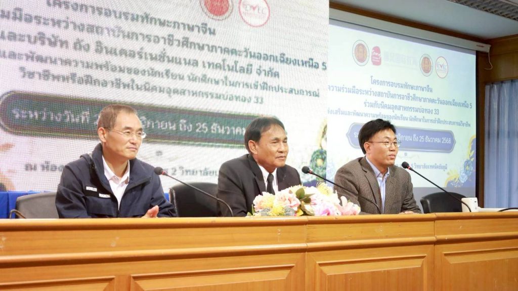 เมื่อวันพฤหัสบดีที่ 20 พฤศจิกายน 2568 วิทยาลัยเทคนิคชัยภูมิ ได้จัดพิธีเปิด โครงการฝึกอบรมทักษะภาษาจีน เพื่อส่งเสริมและพัฒนาความพร้อมของนักเรียน นักศึกษาในการเข้าฝึกประสบการณ์วิชาชีพ ได้รับเกียรติจาก นายสมผัด อินทรมา รองผู้อำนวยการสถาบันการอาชีวศึกษาภาคตะวันออกเฉียงเหนือ 5 พร้อมด้วย นางสาวกรรณิกา ยอดสง่า ผู้อำนวยการวิทยาลัยเทคนิคชัยภูมิ, นายวีระ ชานนท์ รองผู้อำนวยการฝ่ายวิชาการ คณะครู และนักเรียน นักศึกษา ร่วมเข้ารับการอบรมอย่างพร้อมเพรียง โครงการนี้เกิดขึ้นจากความร่วมมือเชิงยุทธศาสตร์ระหว่าง สถาบันการอาชีวศึกษาภาคตะวันออกเฉียงเหนือ 5 กับ นิคมอุตสาหกรรมบ่อทอง 33 มุ่งเน้นการติดอาวุธด้านภาษาที่สาม คือ ภาษาจีน ให้แก่นักศึกษา ซึ่งเป็นภาษาที่สำคัญและจำเป็นอย่างยิ่งในการสื่อสารกับผู้ประกอบการและบุคลากรในภาคอุตสาหกรรมปัจจุบัน การอบรมจะจัดขึ้นอย่างเข้มข้นต่อเนื่องตั้งแต่วันที่ 20 พฤศจิกายน จนถึง 25 ธันวาคม 2568 ณ ห้องประชุมกังสดาล วิทยาลัยเทคนิคชัยภูมิ การพัฒนาทักษะภาษาจีนในครั้งนี้ จะช่วยให้นักศึกษามีความได้เปรียบในการเข้าสู่ตลาดแรงงาน และสามารถสื่อสารได้อย่างมั่นใจในระหว่างการฝึกประสบการณ์วิชาชีพ อันจะนำไปสู่การจ้างงานที่มีคุณภาพและมีค่าตอบแทนสูงในอนาคต